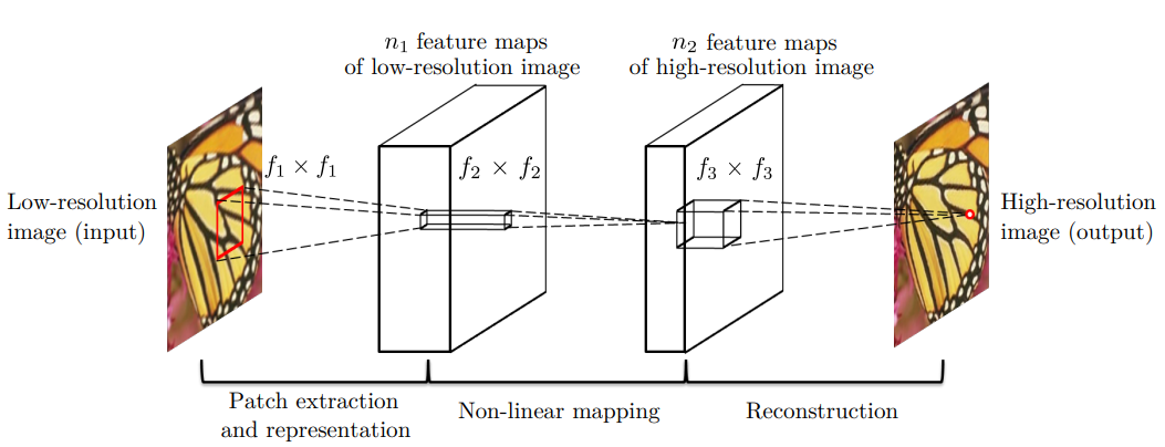 SRCNN은 다음의 3단계로 이루어져있다. 여기서 중요한 점은 모든 단계를 convolution layer를 활용하여 모든 필터의 weight, bias를 optimize한다.