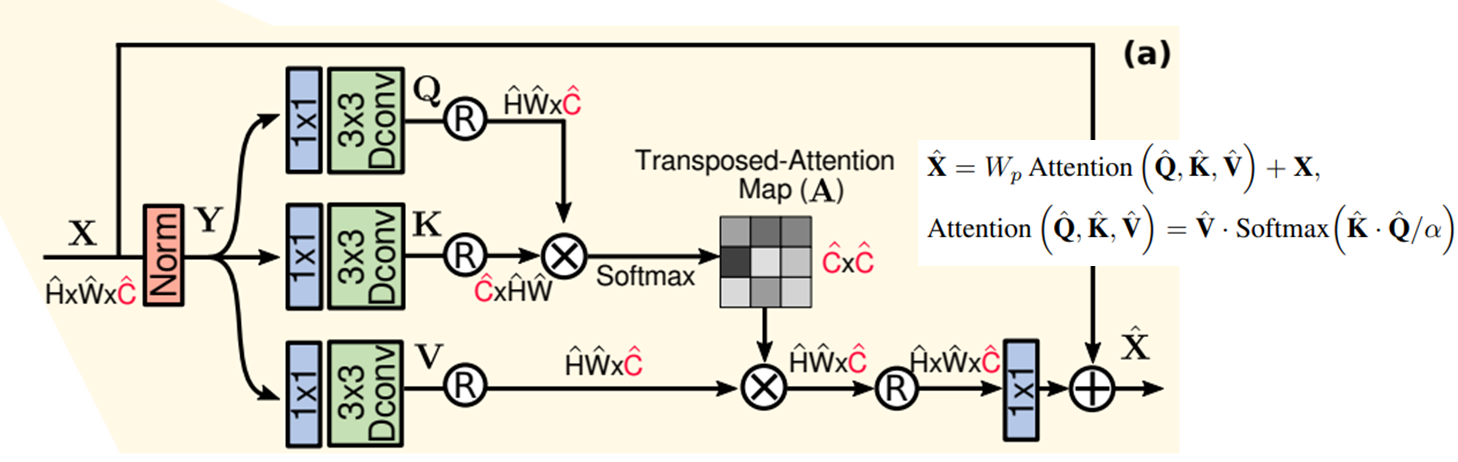 - MDTA(Multi-Dconv Head Transposed Attention)