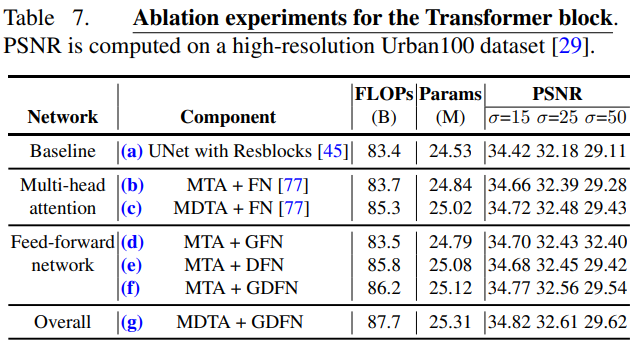 아래는 연산량에 대한 ablation study인데, MDTA+GDFN을 사용했을 때 연산량이 실제로 감소하지는 않아서 확인해볼 필요가 있어 보인다. 하지만 연산량의 차이가 그렇게 크지 않은데, 기존의 Resblock으로 구성된 UNet baseline model보다 성능이 더 좋다는 점에 의의를 두는 것 같다.